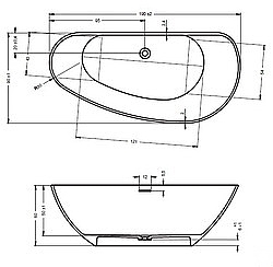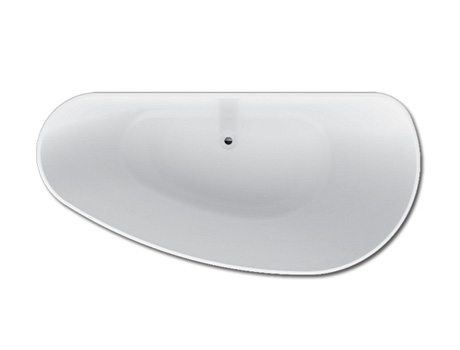 Vrijstaand, solid surface afgeplat eivormig bad, met inwendige overloop en pop-up. Geen whirlpoolsystemen mogelijk.