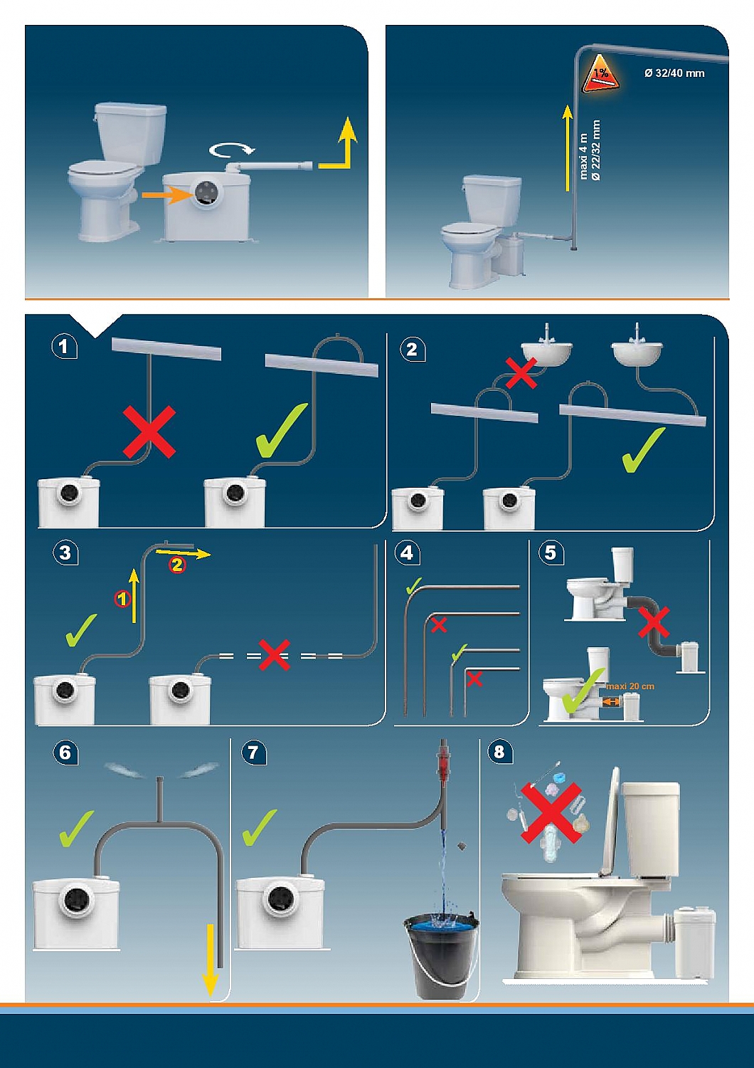De pomp kan afvalwater wegpompen tot ongeveer 5 meter omhoog of tot circa 100 meter horizontaal. Dat maakt het mogelijk om een toilet aan te sluiten op plekken waar een normale afvoer niet haalbaar is.