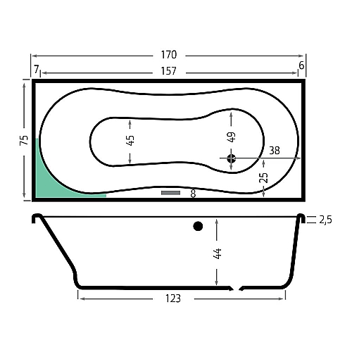 - 170x75x47 cm, inclusief badpoten. (LxBxD)