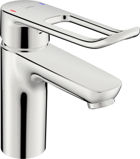 De Hansa Hansacare wastafelkraan met vaste uitloop en sprong van 114 mm (46022286) is een praktische 1-gats opbouwkraan in chroom. De beugelgreep maakt deze kraan extra toegankelijk en eenvoudig te bedienen, ook met minder kracht in je handen.