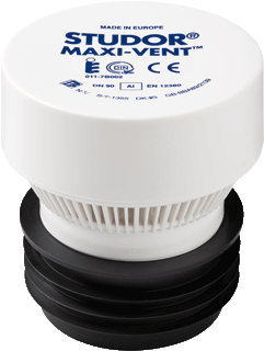 De Maxi-Studor is een binnenbeluchter, uitgevoerd in ABS-/PVC-mix (huismateriaal ABS). Hij past op afvoerbuizen met diameter Ø 75, Ø 90, Ø 100 en Ø 110 mm – dankzij meegeleverde verloopstukken voor de kleinere diameters. Hoogte is ca. 135 mm, uitwendige diameter aansluiting ca. 110 mm. Geen zichtbare delen op het dak; hij kan in de wand / afvoerleiding gemonteerd worden. :contentReference[oaicite:1]{index=1}