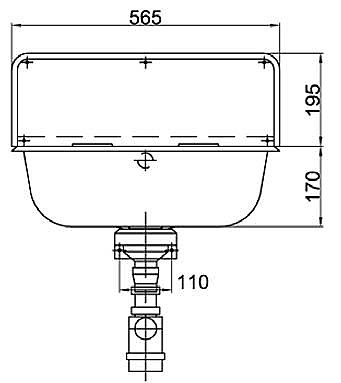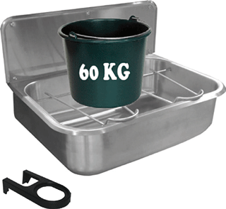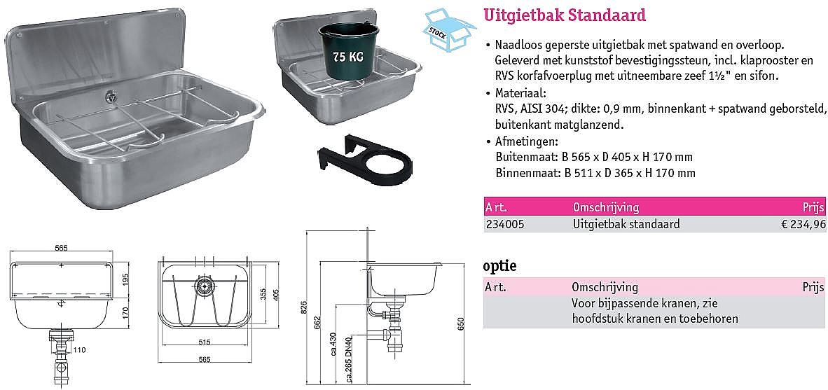 Naadloos geperste uitgietbak met spatwand. Geleverd met muursteunen.