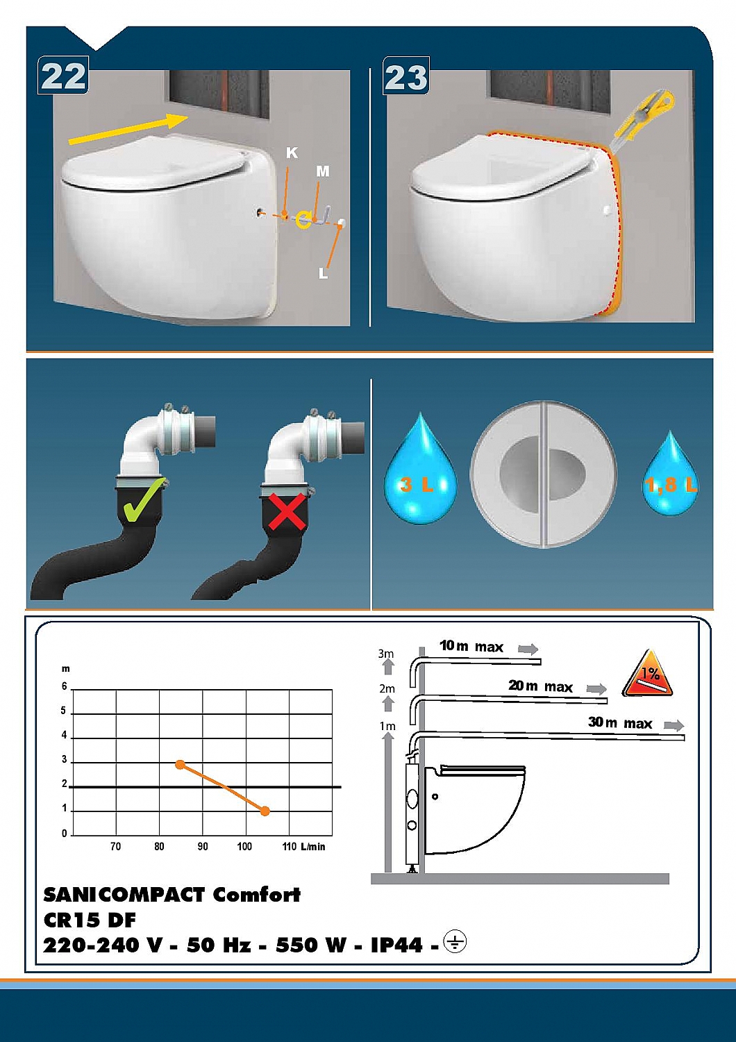 Handig als je een extra toilet wilt zonder hak- en breekwerk. De vermaler pompt afvalwater omhoog of horizontaal weg via een smalle leiding. De motor start automatisch bij het spoelen en stopt zodra het reservoir leeg is. De ECO+ techniek houdt het waterverbruik laag. Aansluiten kan op een normale 230V-voorziening.