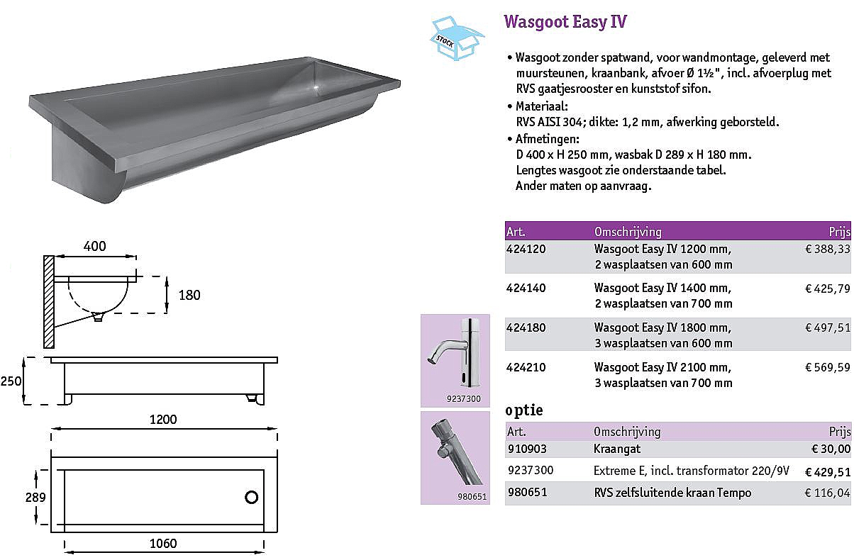 | Voorzien van | Muursteunen, kraanbalk en afvoerplug |