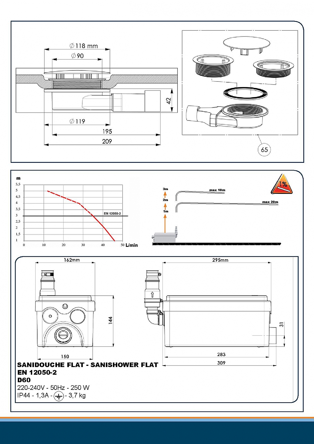 De Sanidouche Flat is dé oplossing voor badkamers en renovaties waar de afvoer lager ligt dan de douche. Dankzij de vlakke constructie plaats je hem eenvoudig onder de douchebak. Onderhoud blijft minimaal: af en toe schoonmaken en je pomp blijft betrouwbaar werken.