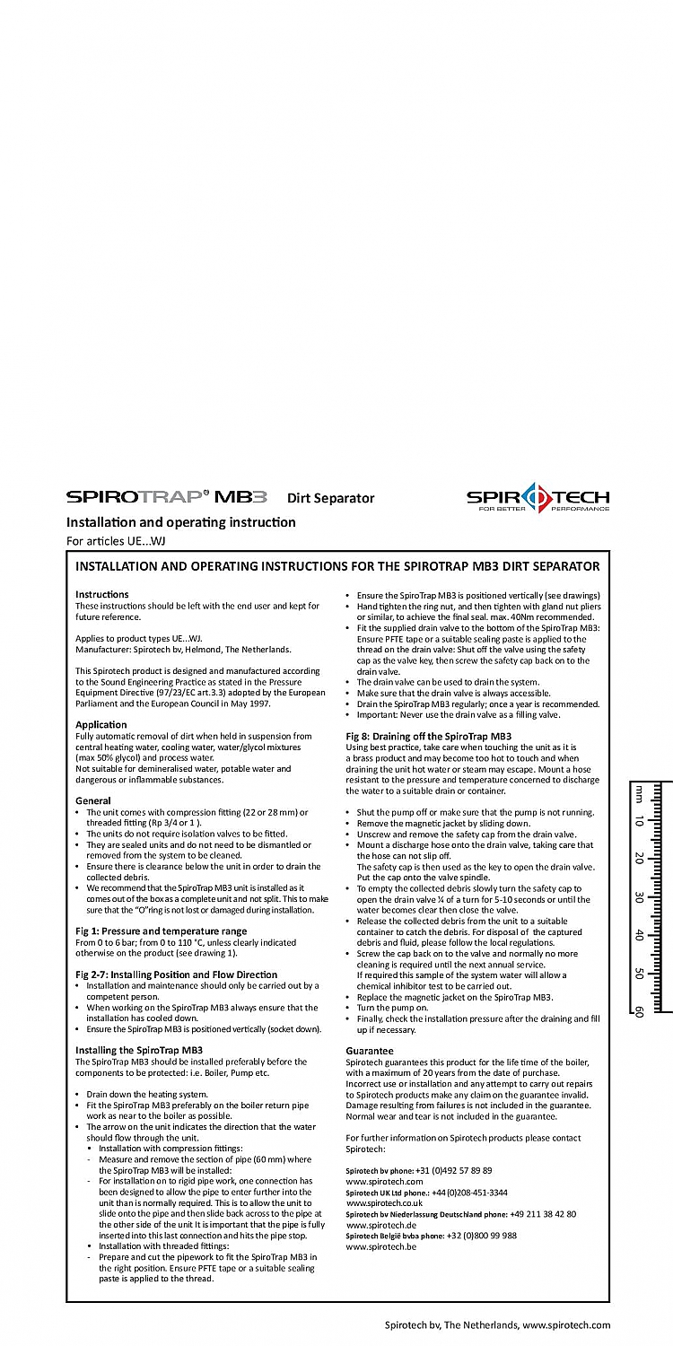 De energie-efficiënte verwarmings- en koelinstallaties van vandaag kunnen alleen een optimaal rendement leveren wanneer het installatiewater vrij is van vuil. In onbehandelde installaties kan vuil zich op verschillende plaatsen in de gehele installatie ophopen. Uit onderzoek maar ook vauit de praktijk komt naar voren dat met name magnetiet leidt tot verminderde energie-efficiëntie en daardoor hogere energiekosten. Snelle en effectieve vuilverwijdering is daarom zeer belangrijk. Spirotech biedt een uitgebreid assortiment SpiroTrap vuilafscheiders die speciaal zijn ontwikkeld voor het verwijderen van vuil: van kleine messing units tot stalen units voor intensief gebruik.Specifieke kenmerken