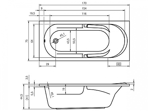 Inbouwbad, hoogglans wit acryl bad, met armsteunen, afvoer bij het voeteneind. Tevens verkrijgbaar met de whirlpoolsystemen: Air of Flow.