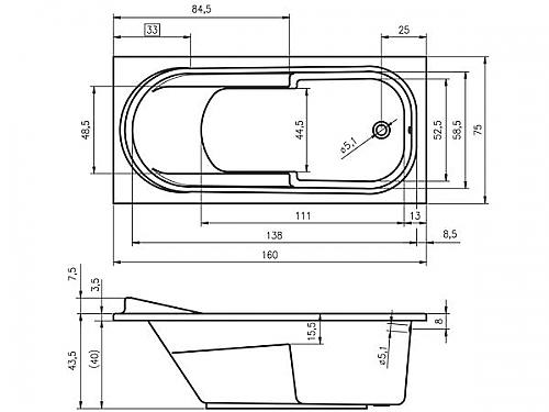 Inbouwbad, hoogglans wit acryl bad, met armsteunen, afvoer bij het voeteneind. Tevens verkrijgbaar met de whirlpoolsystemen: Air of Flow.