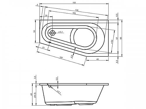 Inbouwbad, hoogglans wit acryl bad, afgeschuind model met douchevlak, afvoer bij het voeteneind. Tevens verkrijgbaar met de whirlpoolsystemen: Air, Flow, Joy of Bliss.