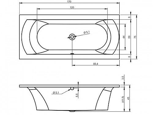 Inbouwbad, hoogglans wit acryl, rechthoekig met afgeronde binnenvorm, afvoer aan de zijkant. Tevens verkrijgbaar met de whirlpoolsystemen: Air, Flow, Joy of Bliss.