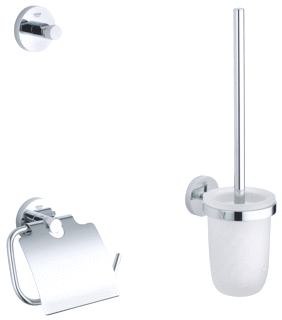Deze Grohe toiletborstelset, handdoekhaak en toiletrolhouder met klep vormen samen deze GROHE Essentials accessoireset, uitgevoerd in gepolijst chroom. De perfecte keus voor in je toiletruimte. Alle Grohe items zijn perfect op elkaar afgestemd en hebben een tijdloos design. Maak jouw toilet of badkamer helemaal af met deze 3-delige set.