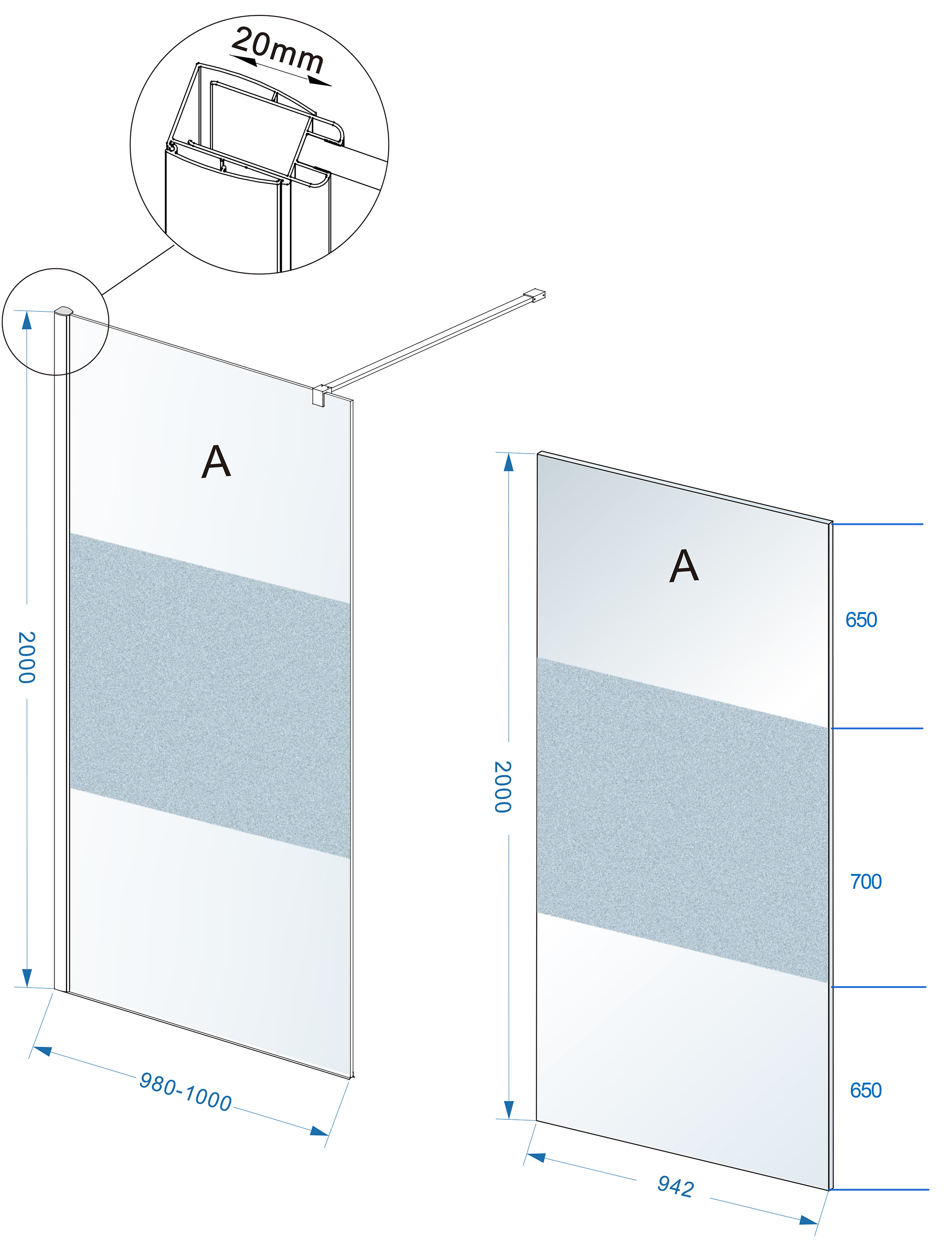 Dit model is ideaal wanneer je meer ruimte wilt dan bij een smalle glaswand, maar geen extra brede opstelling nodig hebt. De combinatie van 1000 mm breedte en gedeeltelijk matglas maakt deze inloopdouche geschikt voor uiteenlopende badkamerindelingen.