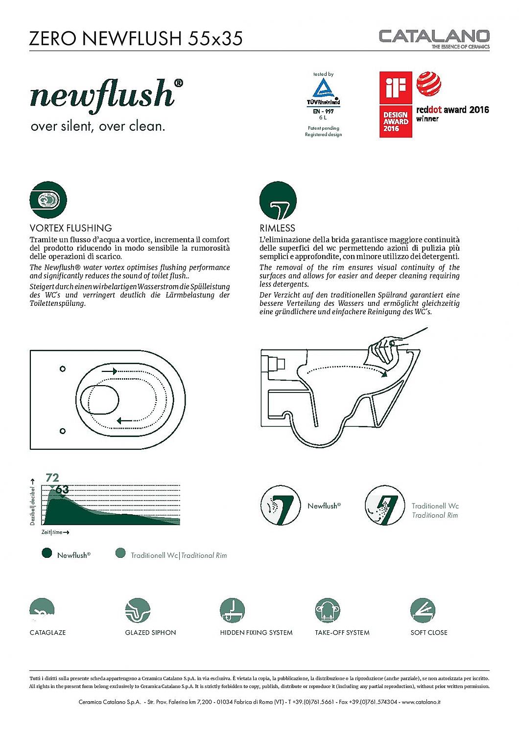 Dit Catalano New Zero wandcloset is voorzien van NewFlush. Dit is Catalano's wandcloset zonder spoelrand en we mogen wel zeggen dat dit het beste wandcloset zonder spoelrand is, op dit moment verkrijgbaar. Waarom is dat? Door het Vortex systeem is er 1 uitgang (ipv 2 bij andere merken) die de straal onder hoge druk het wandcloset inspoelt, van boven in een draaikolk naar beneden. Doordat er maar 1 uitgang is, ontstaat er veel kracht en wordt al het vuil meegenomen. Ook is het met deze techniek gebleken dat het wandcloset veel minder lawaai maakt na het spoelen. Sanispecials.nl heeft hier ook een filmpje over opgenomen waarin het wordt uitgelegd. Dit filmpje gaat over de serie Sfera maar het principe van NewFlush is van toepassing op alle modellen.