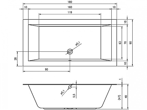 Inbouwbad, met lage badrand, hoogglans wit acryl, rechthoekig met strakke binnenvorm, afvoer aan de zijkant. Tevens verkrijgbaar met de whirlpoolsystemen: Air, Flow, Joy of Bliss.