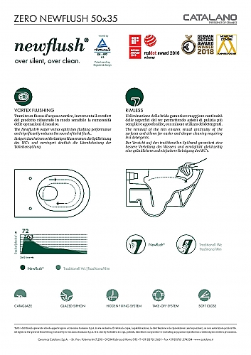 Dit Catalano New Zero wandcloset is voorzien van NewFlush. Dit is Catalano's wandcloset zonder spoelrand en we mogen wel zeggen dat dit het beste wandcloset zonder spoelrand is, op dit moment verkrijgbaar. Waarom is dat? Door het Vortex systeem is er 1 uitgang (ipv 2 bij andere merken) die de straal onder hoge druk het wandcloset inspoelt, van boven in een draaikolk naar beneden. Doordat er maar 1 uitgang is, ontstaat er veel kracht en wordt al het vuil meegenomen. Ook is het met deze techniek gebleken dat het wandcloset veel minder lawaai maakt na het spoelen. Sanispecials.nl heeft hier ook een filmpje over opgenomen waarin het wordt uitgelegd. Dit filmpje gaat over de serie Sfera maar het principe van NewFlush is van toepassing op alle modellen.