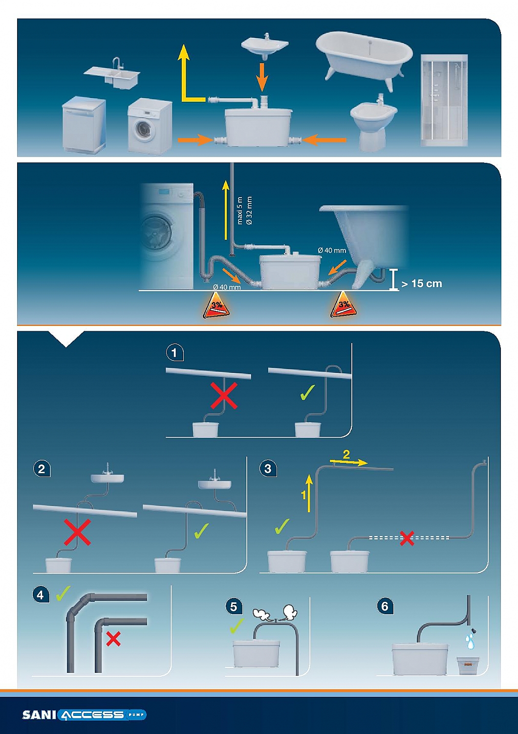 De Saniacces Pump met een modern design, voor het verpompen van afvalwater tot 75ºC van douche, wastafel/fontein, bad en/of (vaat-)wasmachine met een zeer stille werking. Toegang tot de Saniacces Pump wordt verkregen door middel van twee afneembare deksels aan de bovenzijde. Dus mocht er onverhoopt een defect optreden dan is de bedrijfszekerheid is gegarandeerd, en is de Saniacces Pump dus ideaal voor een bed & breakfast, kantoor, praktijk of salon aan huis.